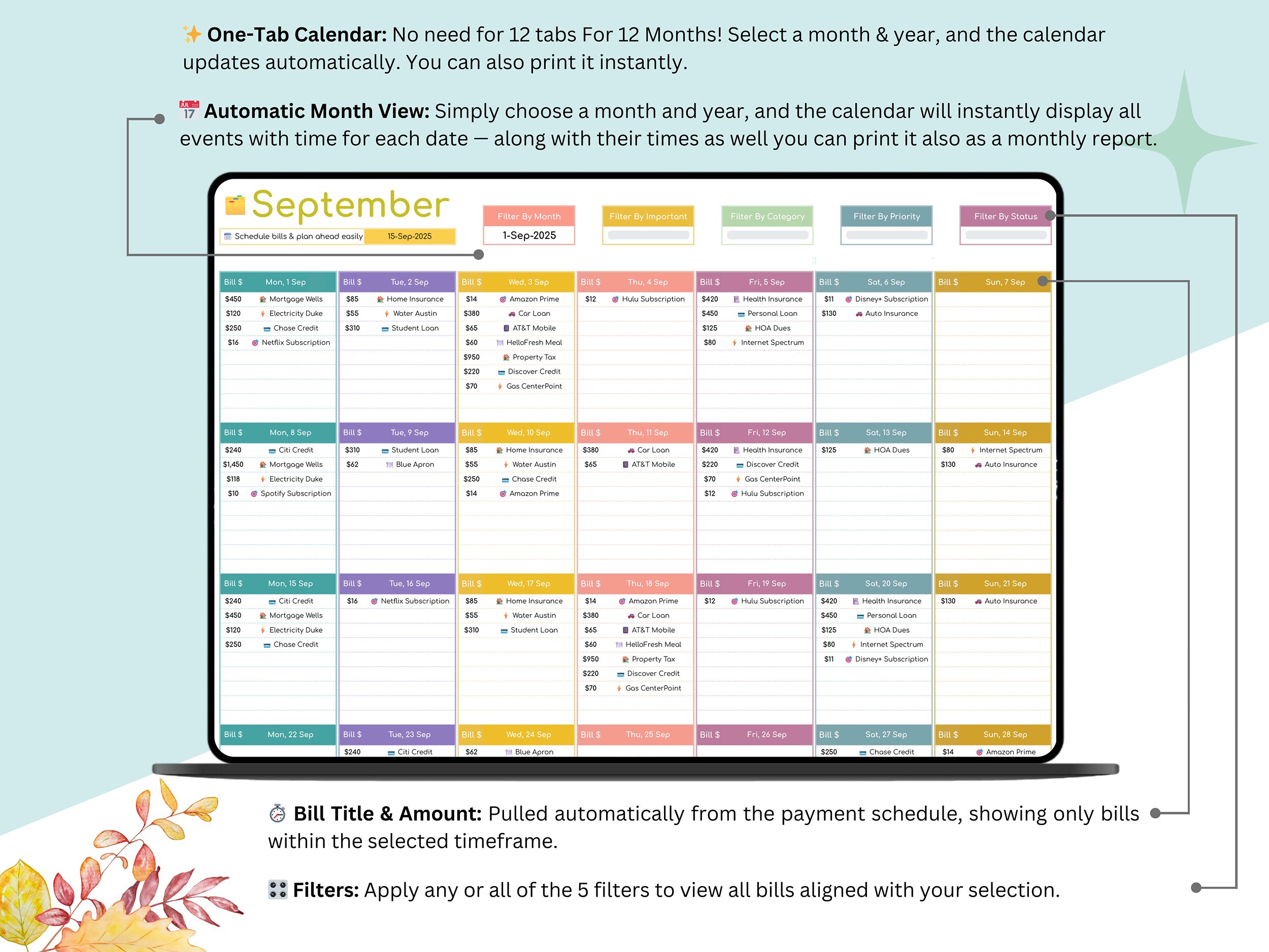 Effortlessly schedule, monitor, and review all your bills with a sleek, fully-automated interface. This all-in-one bill tracking spreadsheet is perfect for managing due dates, visualizing upcoming expenses, and maintaining a stress-free budget. ✅