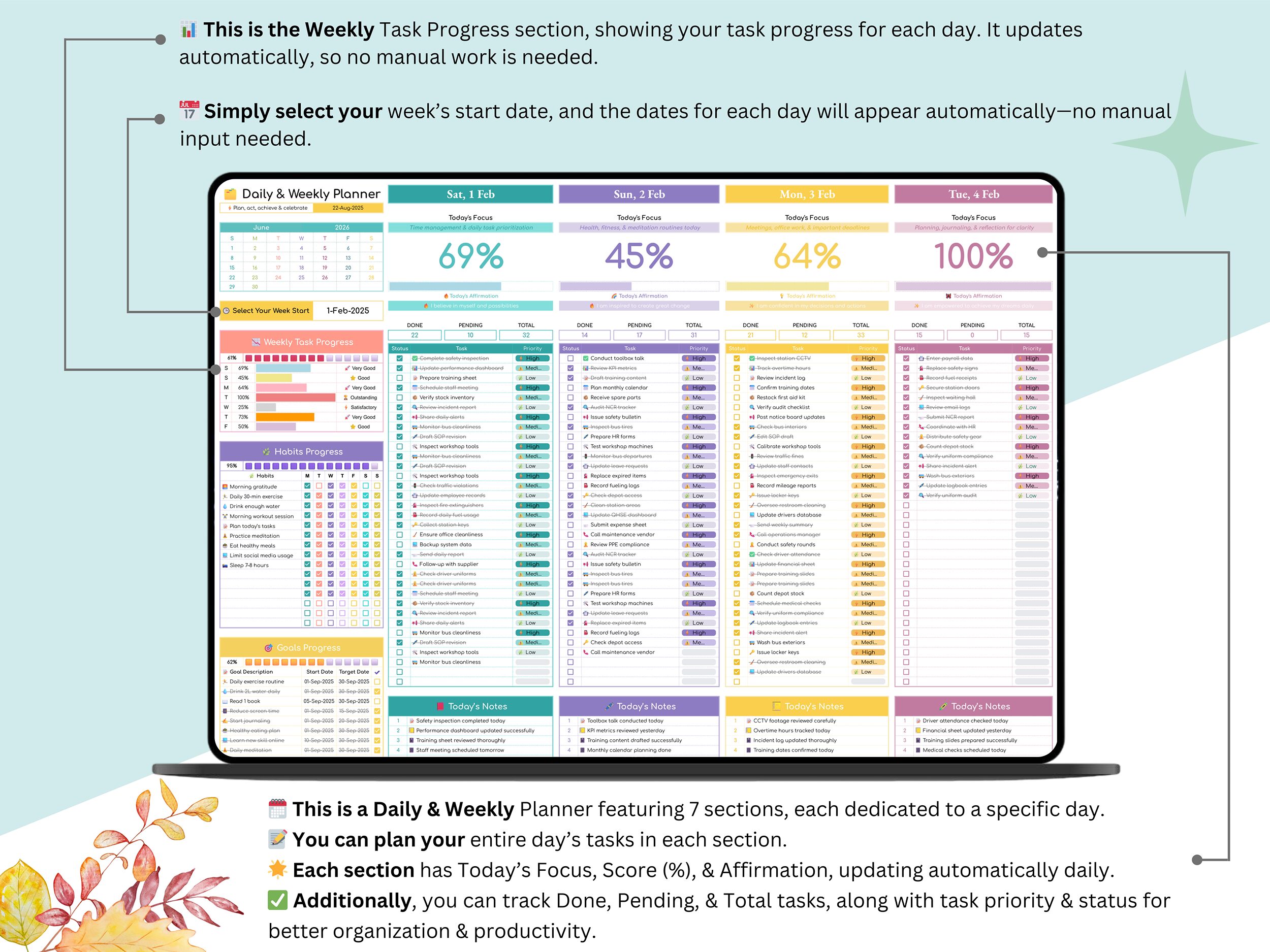4οΈβ£ Track daily tasks, daily and weekly progress, habits, goals, and notes effortlessly β