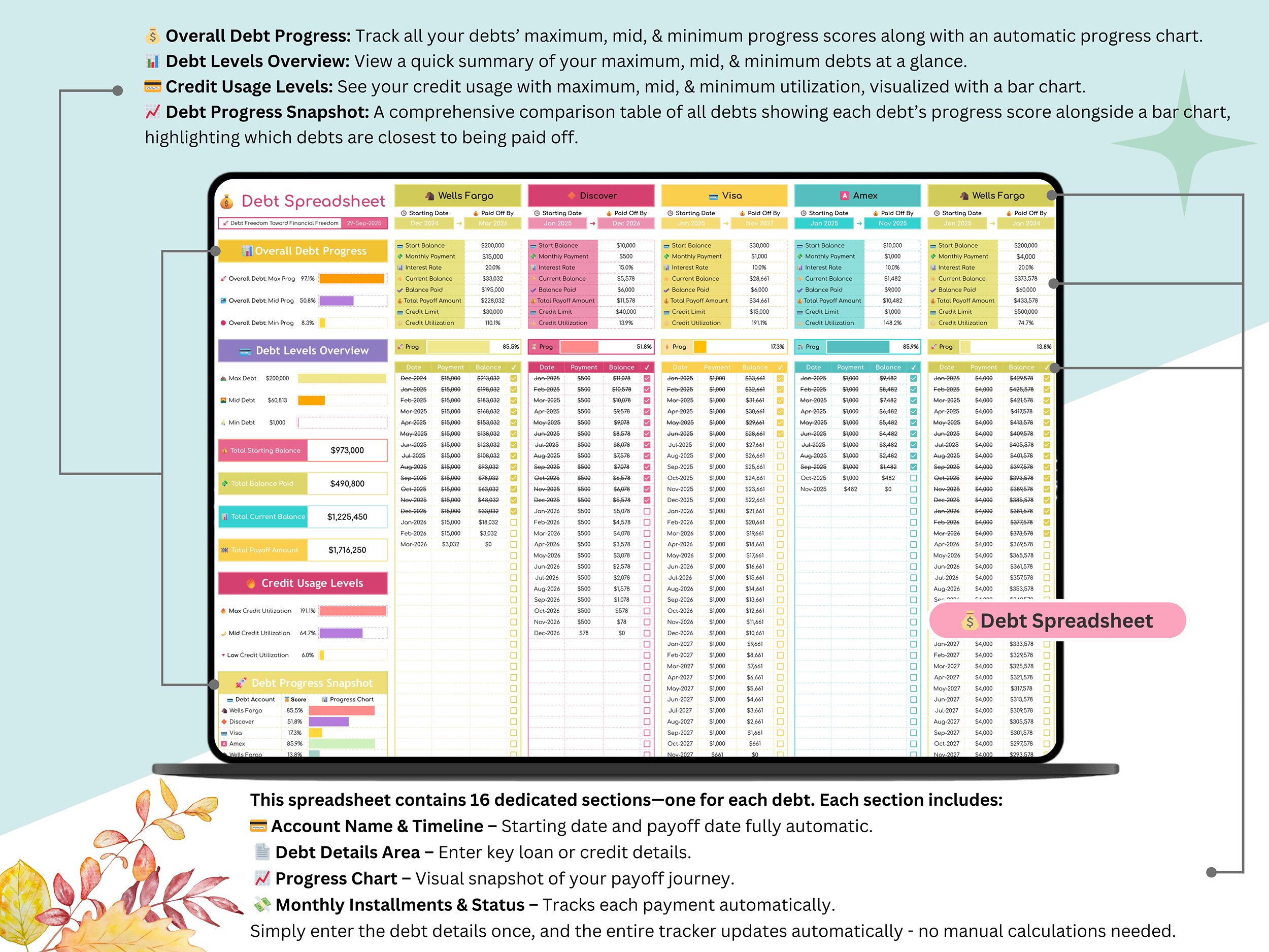 ποΈ 16 Dedicated Debt Sections β One section for each debt account with automatic calculations.