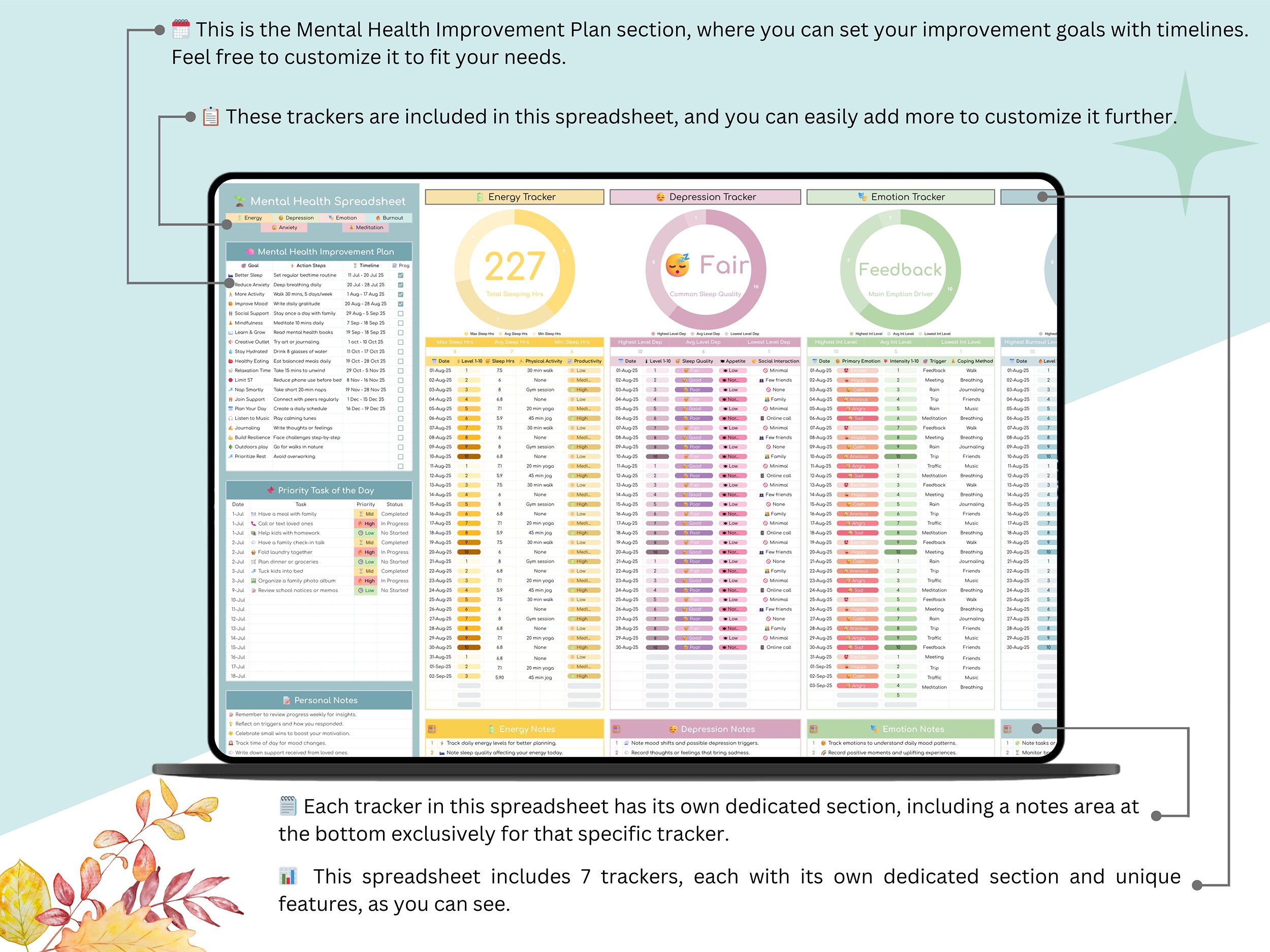 This Mental Health Spreadsheet is ideal for anyone committed to improving their emotional and physical well-being every day: