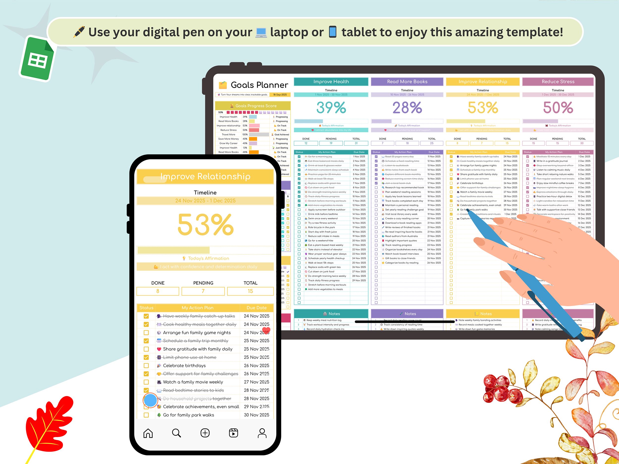 ✅ Action Plan Columns – List tasks with deadlines and automatically see what’s done, pending, or total for each goal.