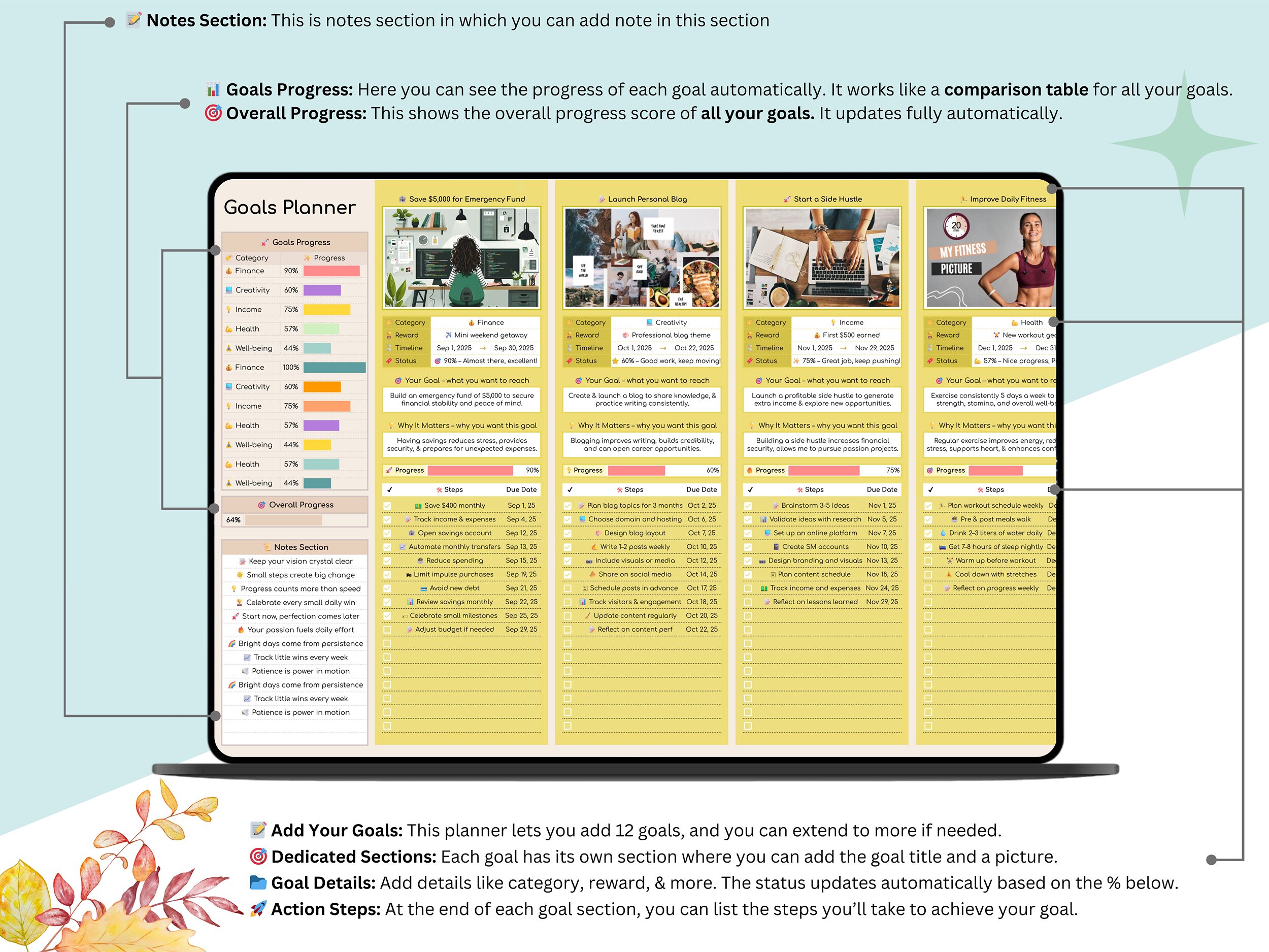 π Achieve Your Dreams with the Automatic Goals Planner (This goals planner is available in 4 Beautiful Themes – you can select any for your use)