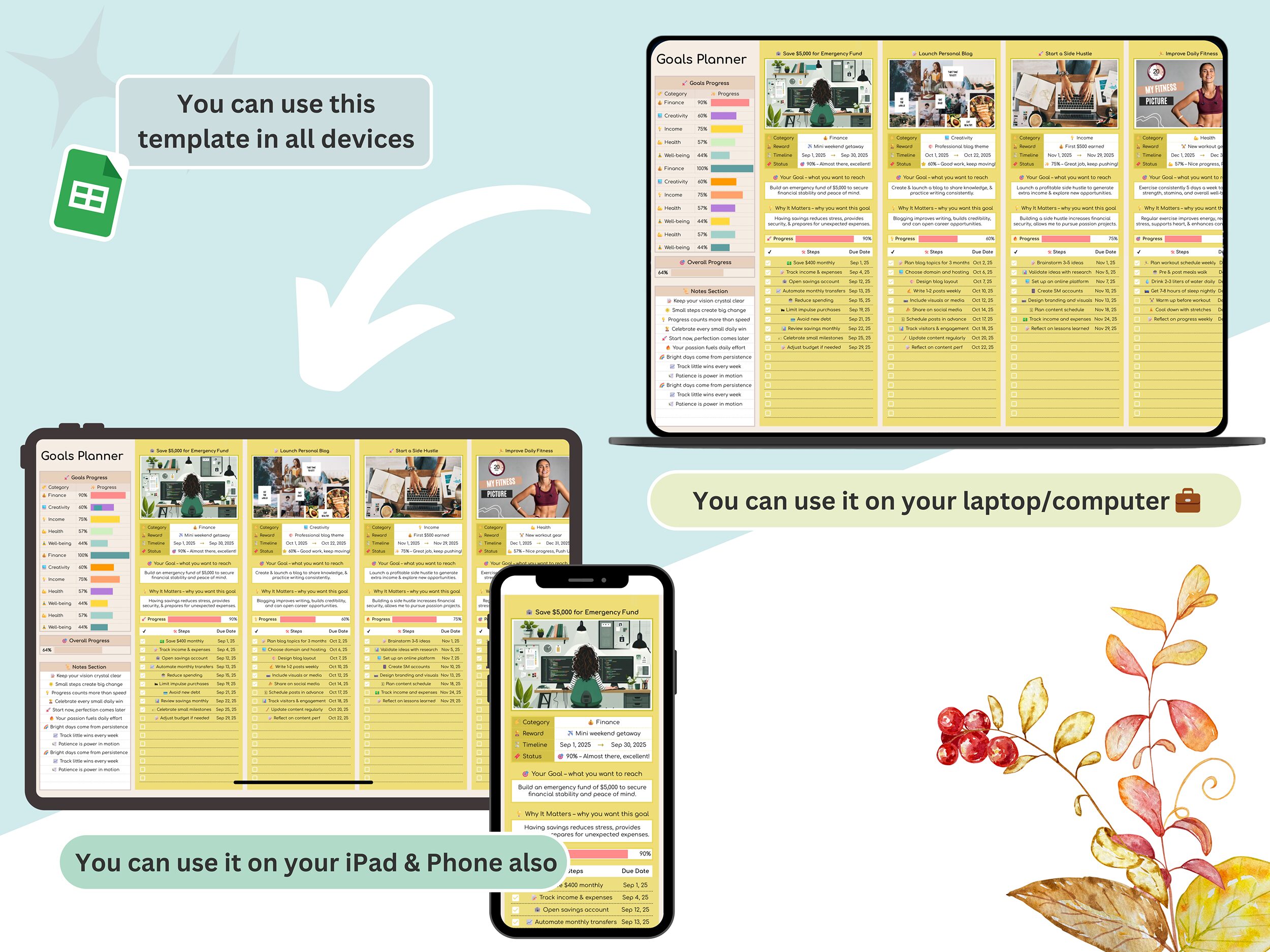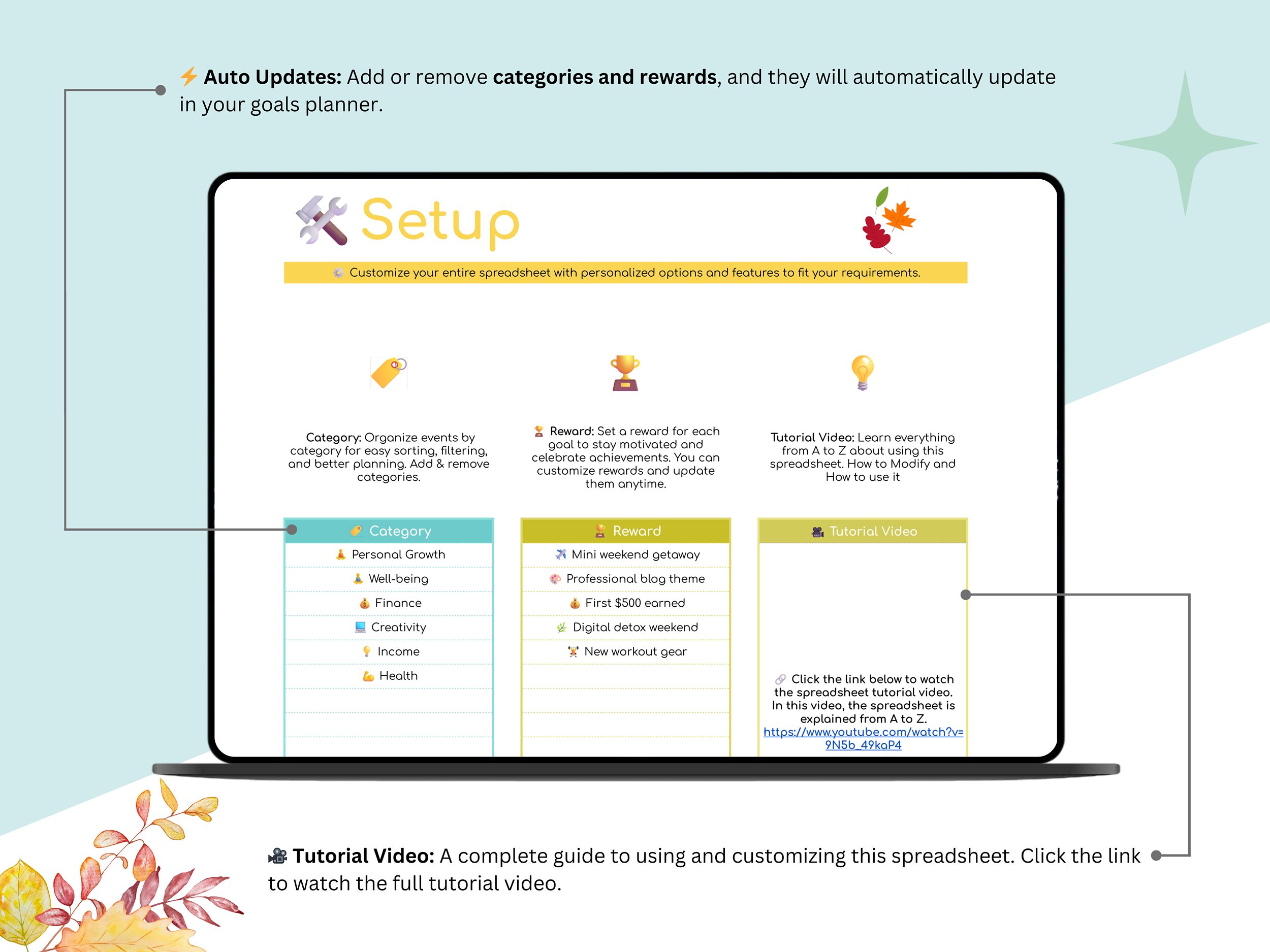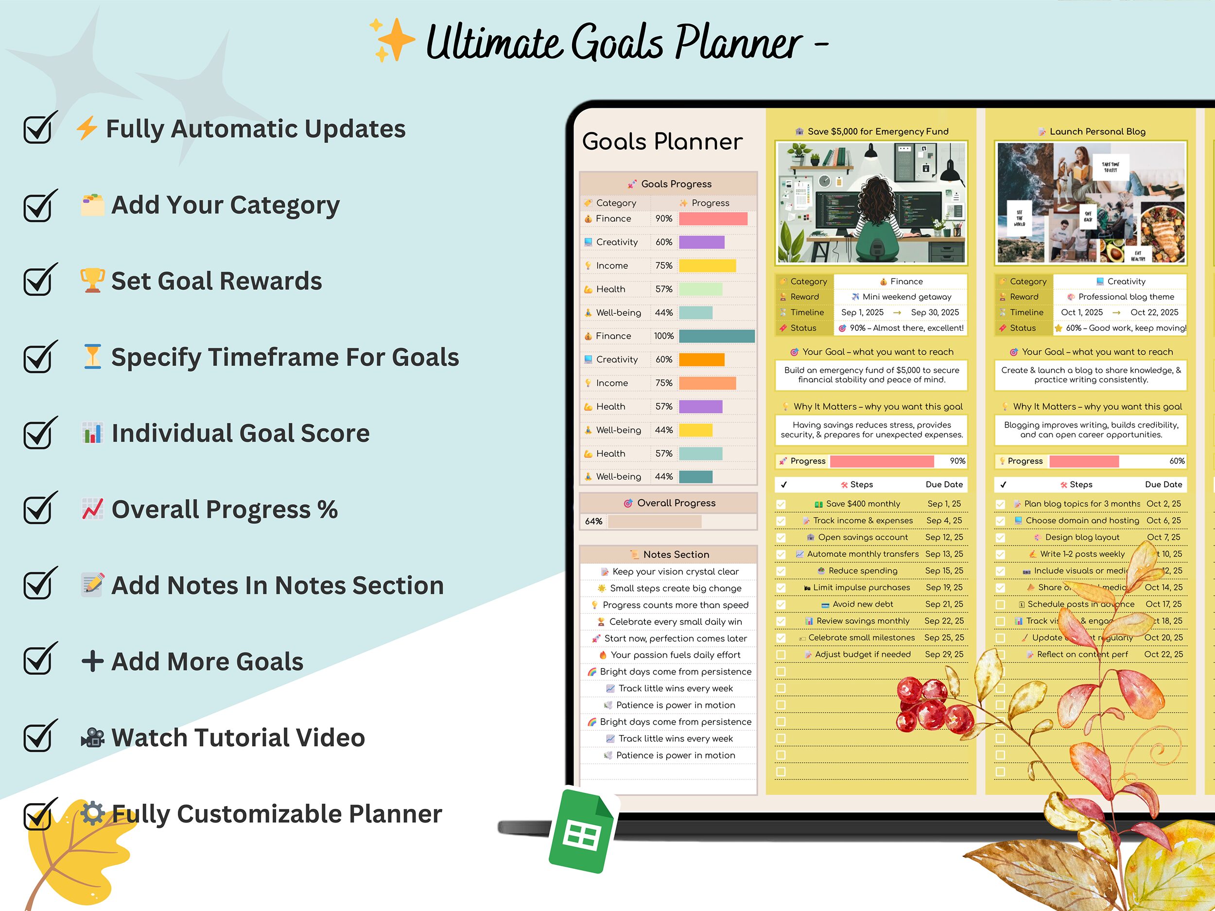 β¨ Stay focused, stay inspired, and reach your goals faster with this beautifully designed Automatic Goals Planner β available in 4 unique themes in one spreadsheet! π