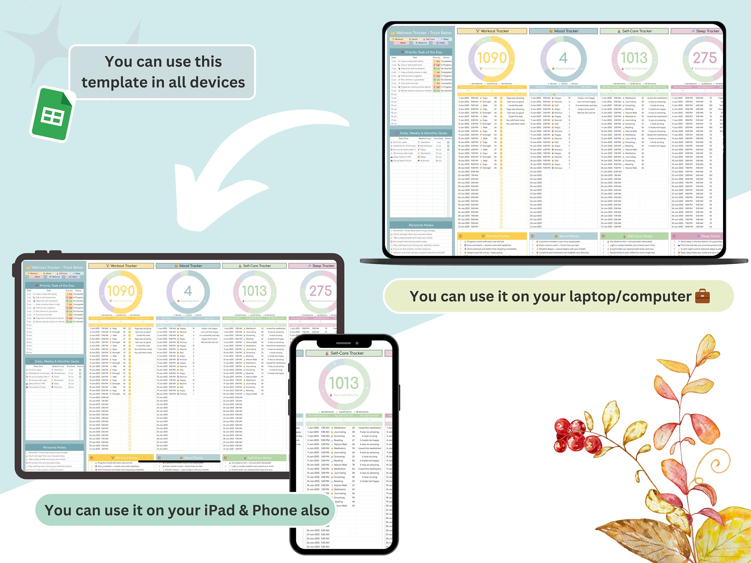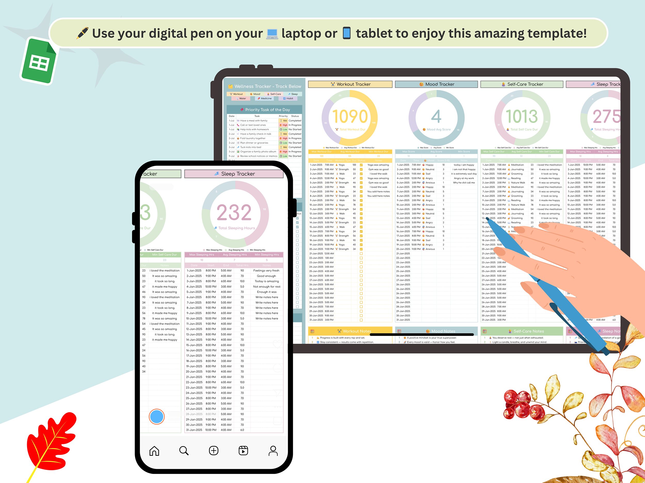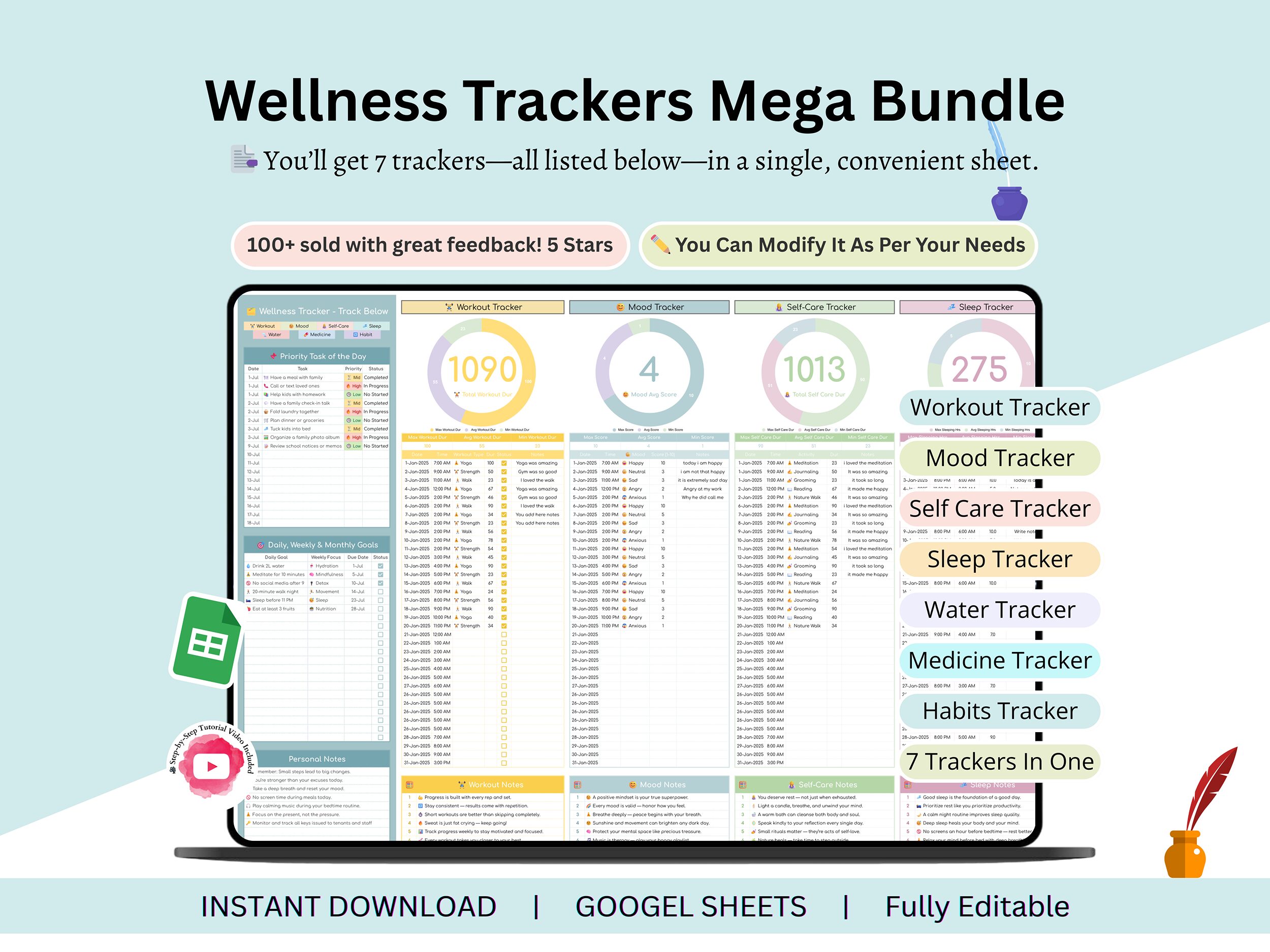 A Powerful 7-in-1 Wellness Tracker (Google Sheets): A professionally designed, easy-to-use Google Sheets tracker – track your workouts, sleep, mood, self-care, water intake, medicines, and habits effortlessly.