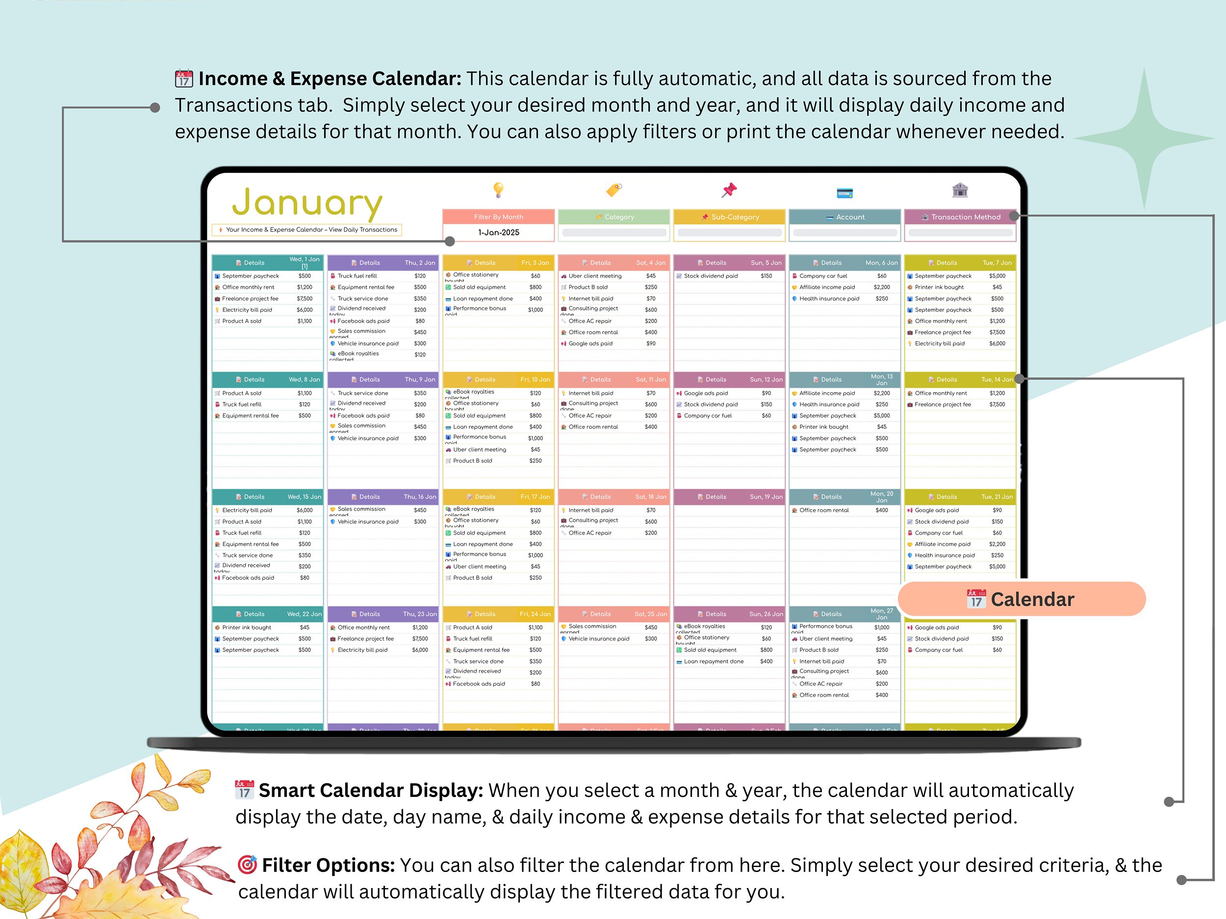 6οΈβ£ ποΈ Income & Expense Calendar β A smart calendar that shows daily income and expense totals for each day of the month β automatically generated and easy to read!