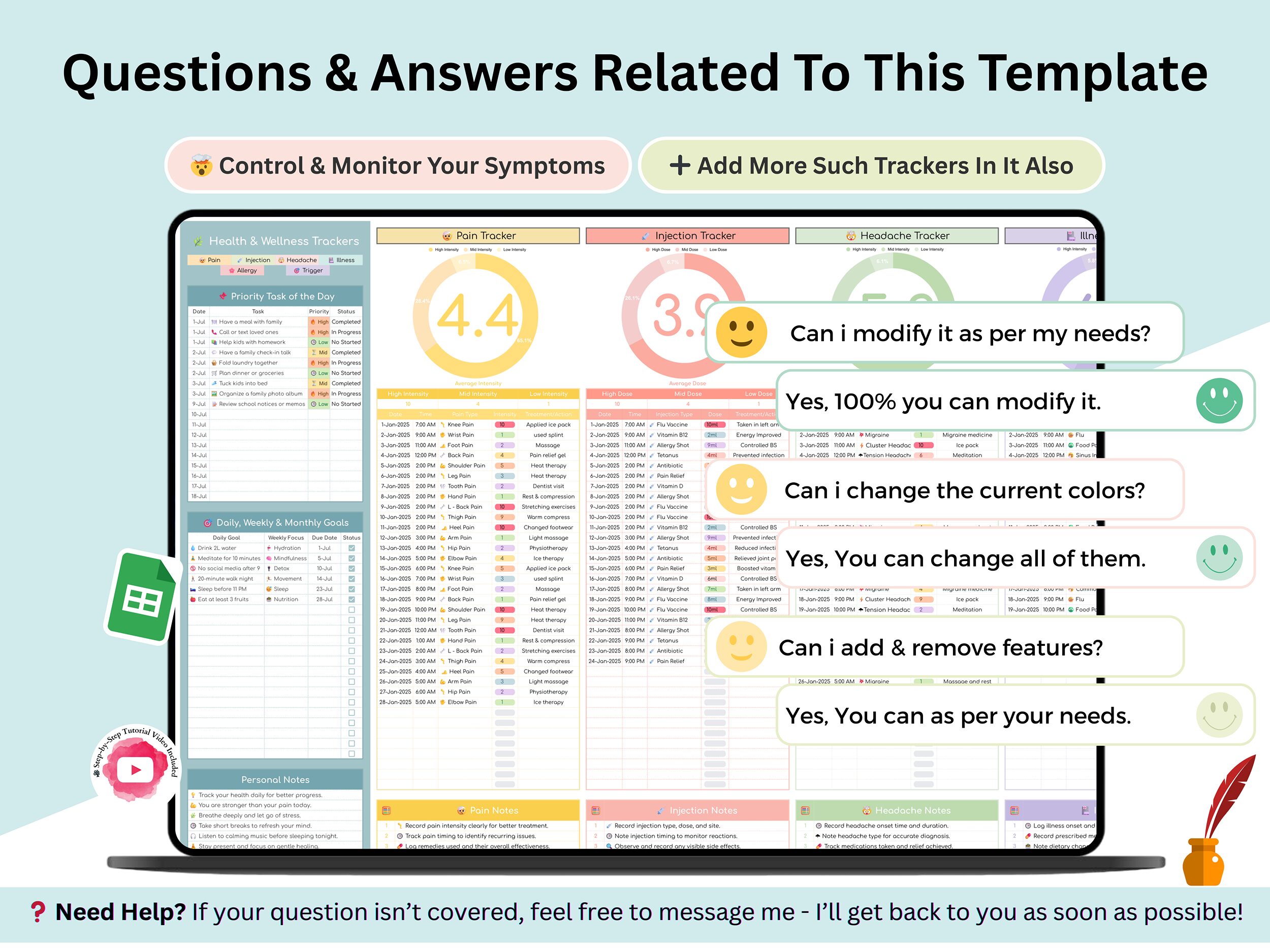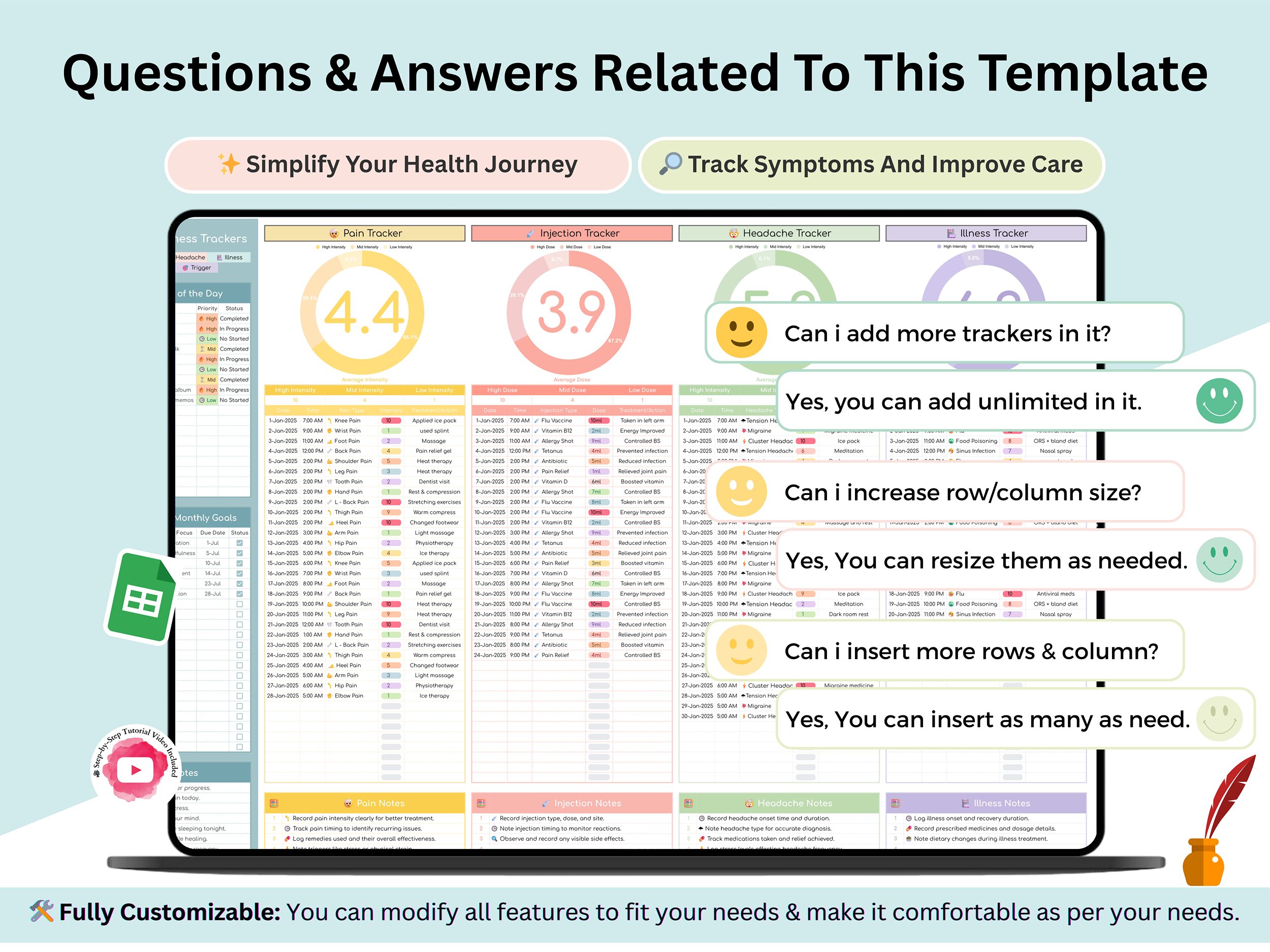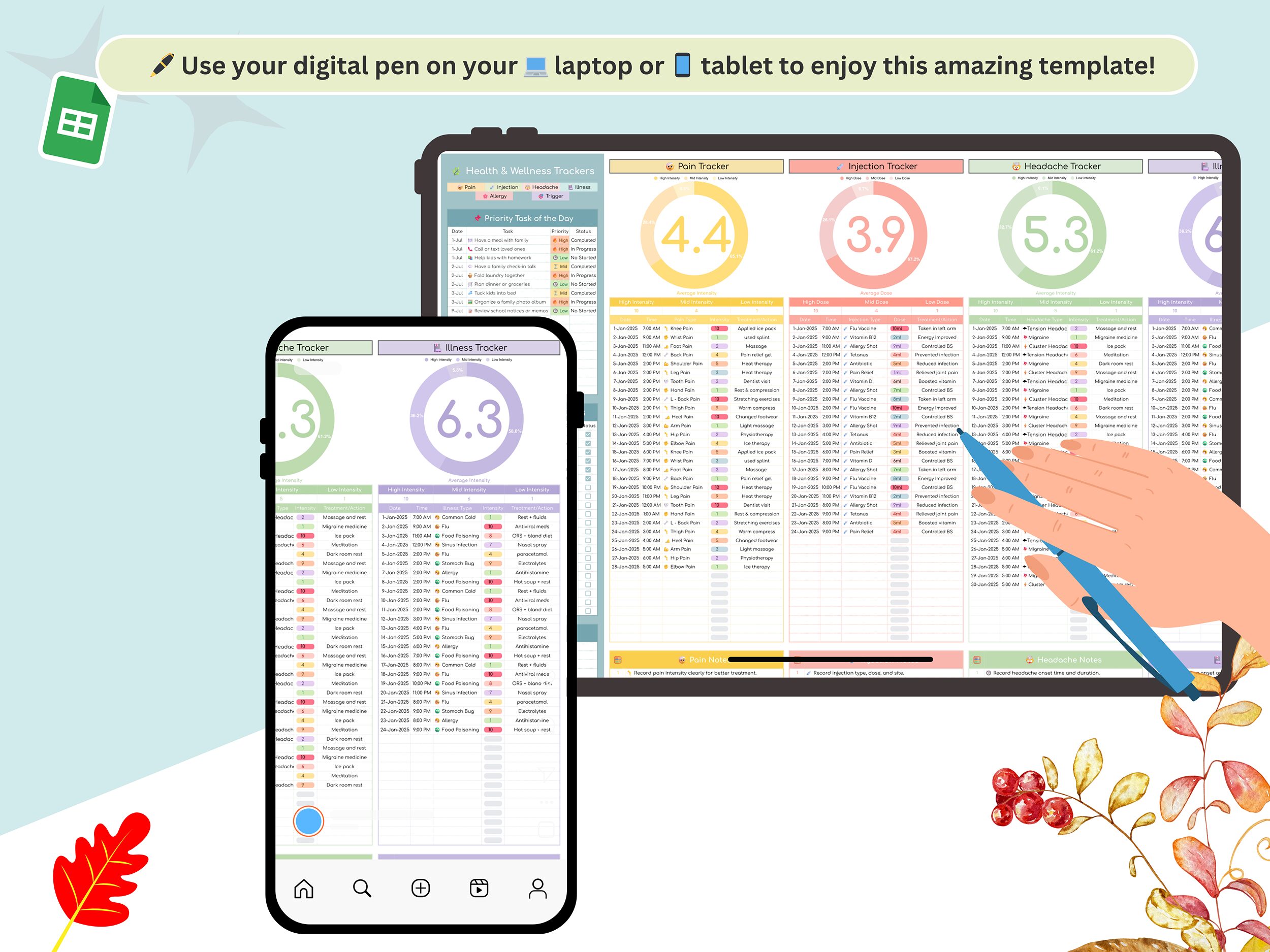 Health & Wellness Trackers (Google Sheets): A beautifully designed tracker to manage your pain, injections, headaches, illnesses, allergies, triggers, and daily health habits β all in one place.