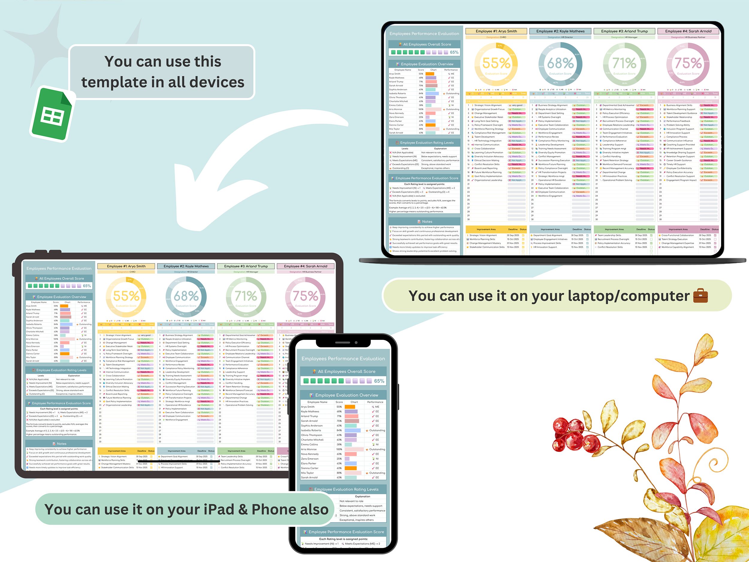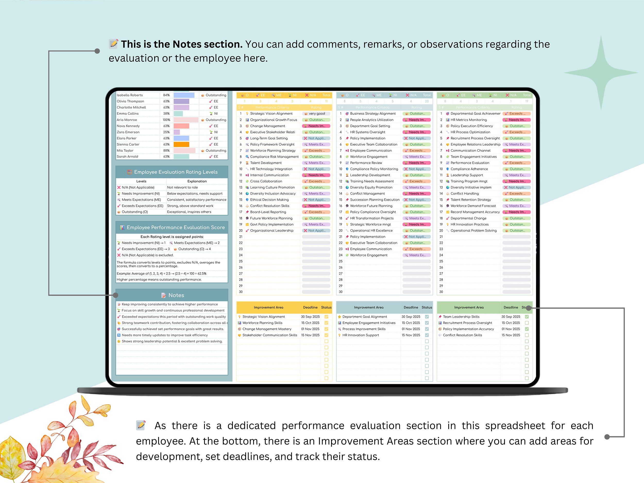 π Comprehensive Evaluation sections covering key performance areas like communication, leadership, and teamwork of each employee evaluation.