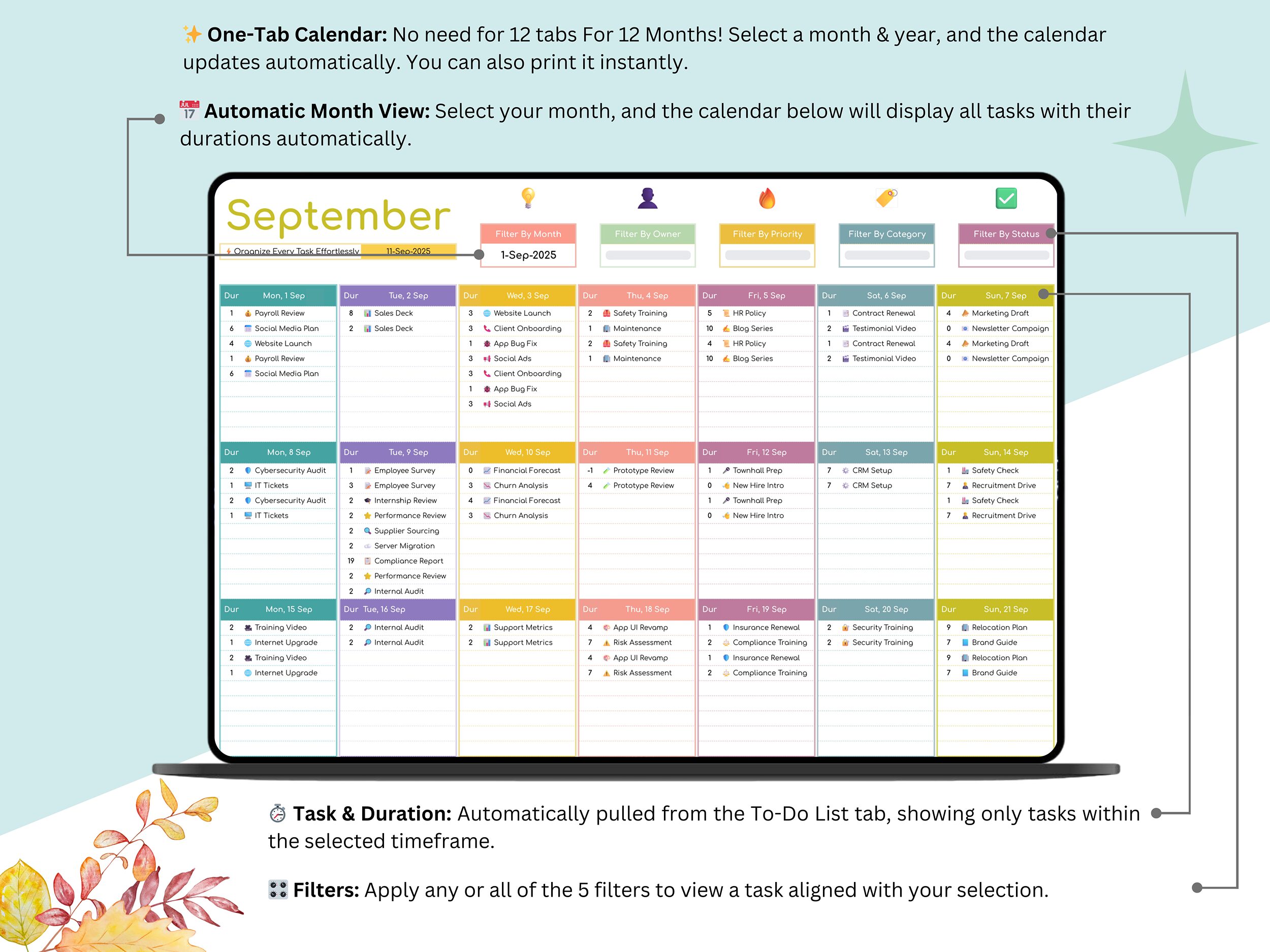🗓️ Calendar Tab – Select any month to instantly view day-by-day tasks pulled from the tracker for whole month.