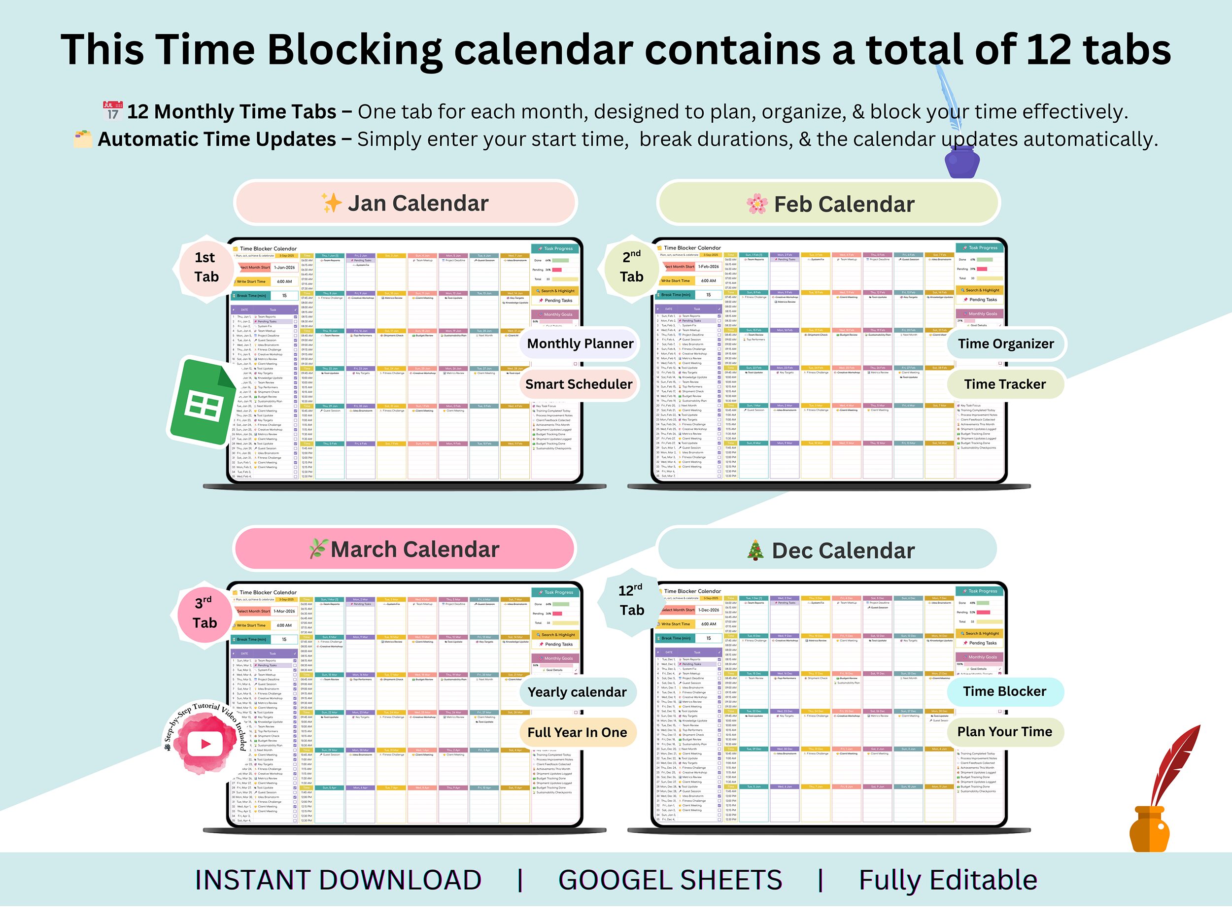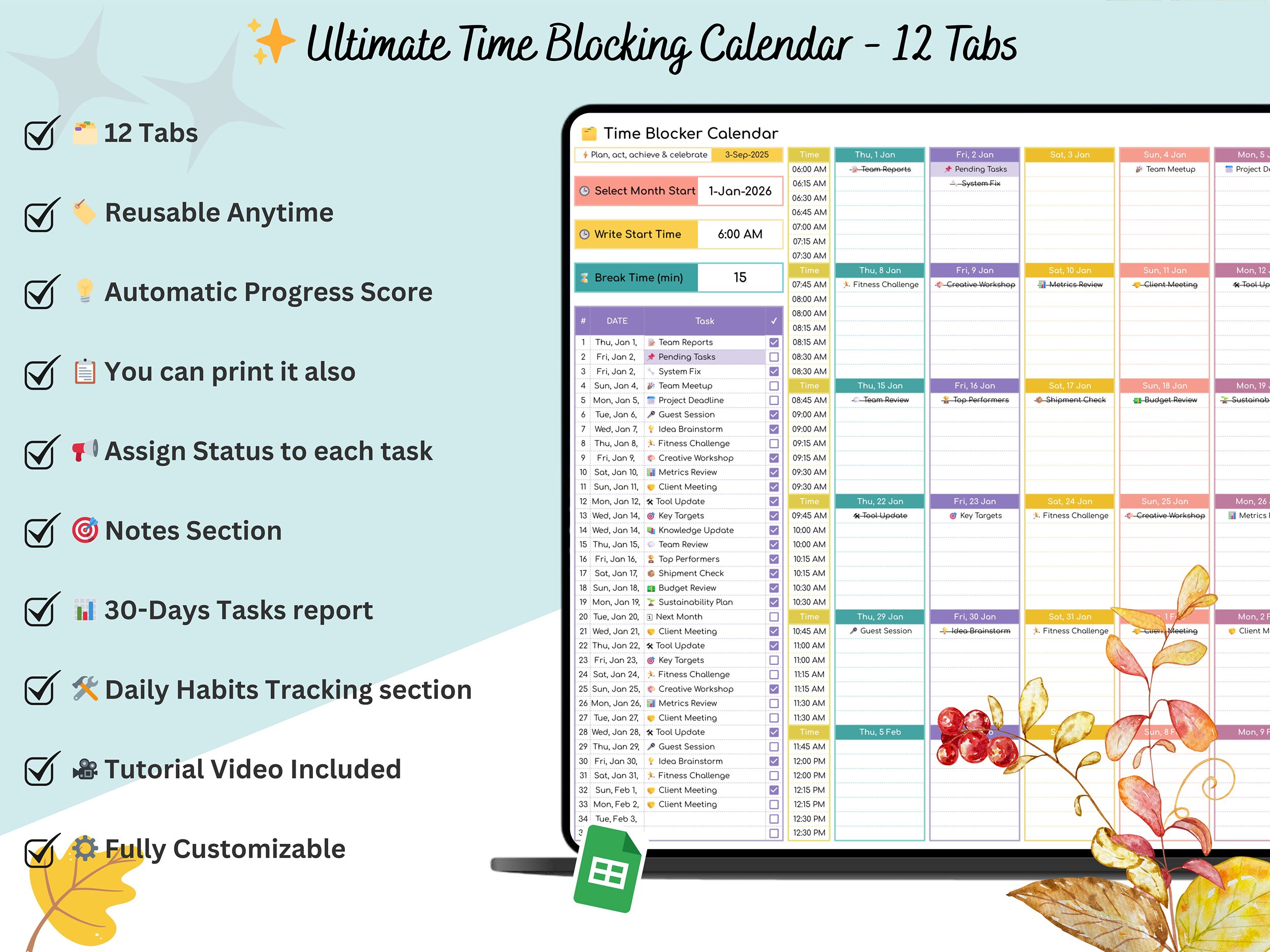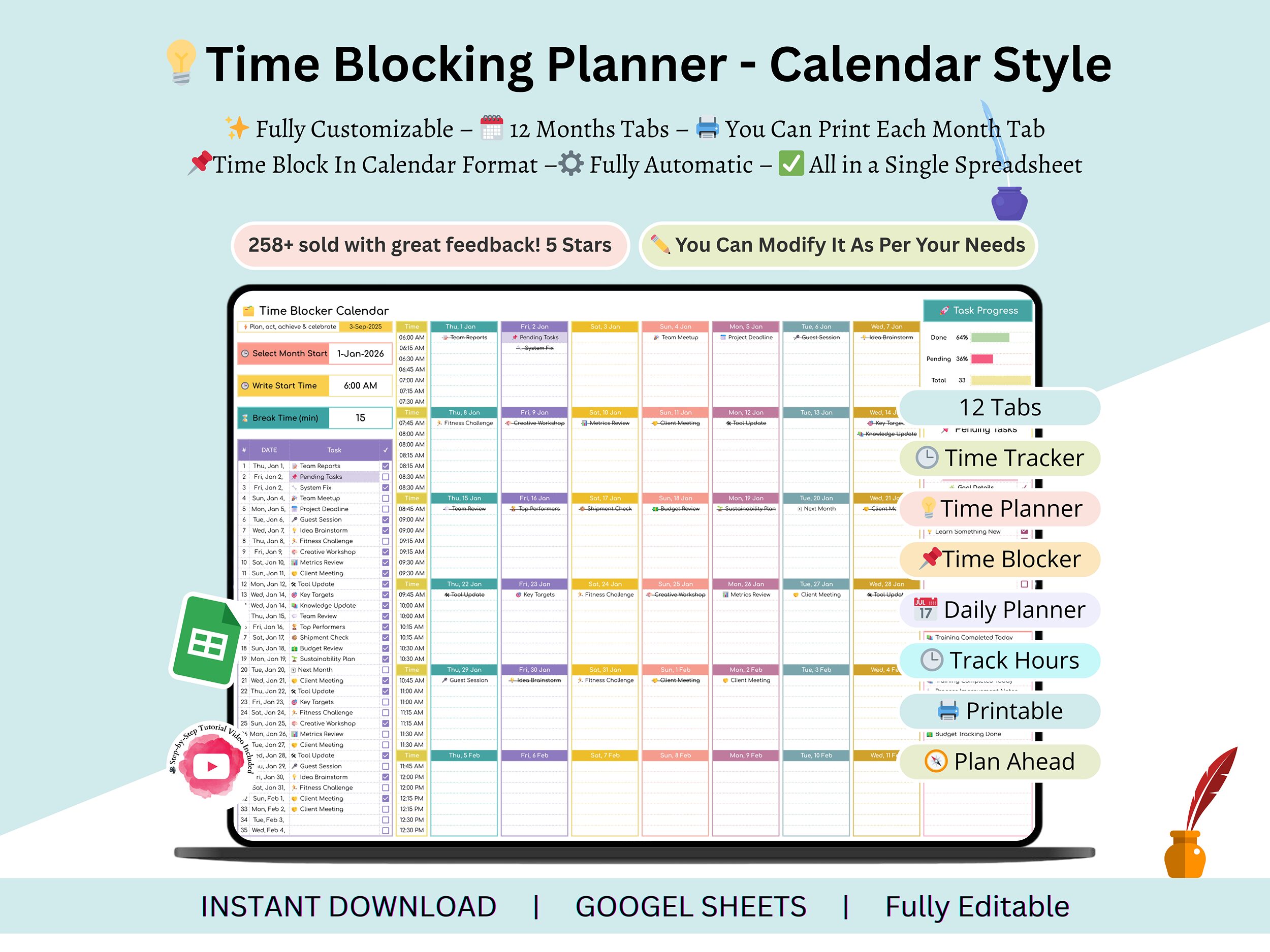 Stay organized and productive with our Time Blocker Calendar Spreadsheet – the ultimate Google Sheets planner to help you manage your tasks, events, routines, and goals all year round! ⏰✨