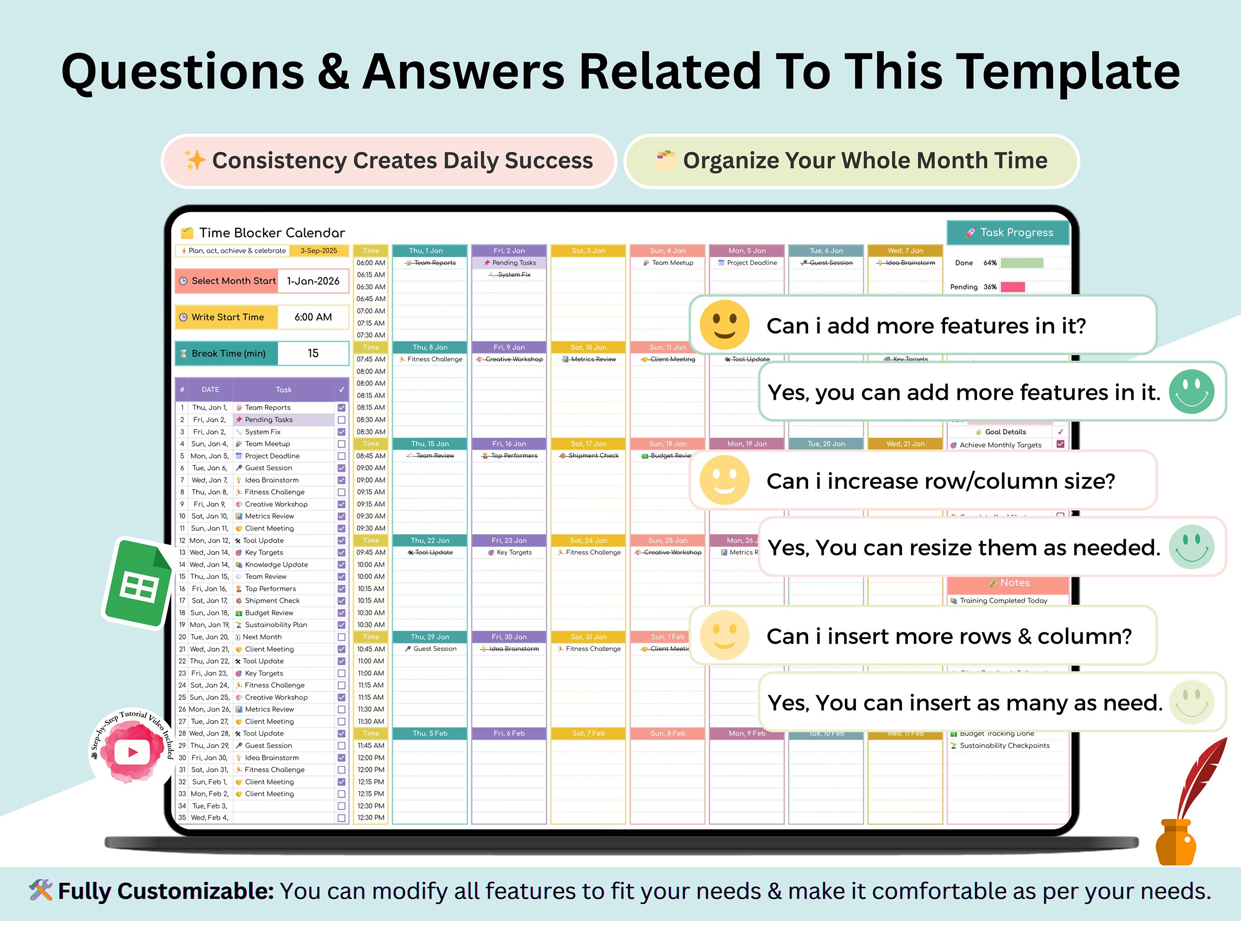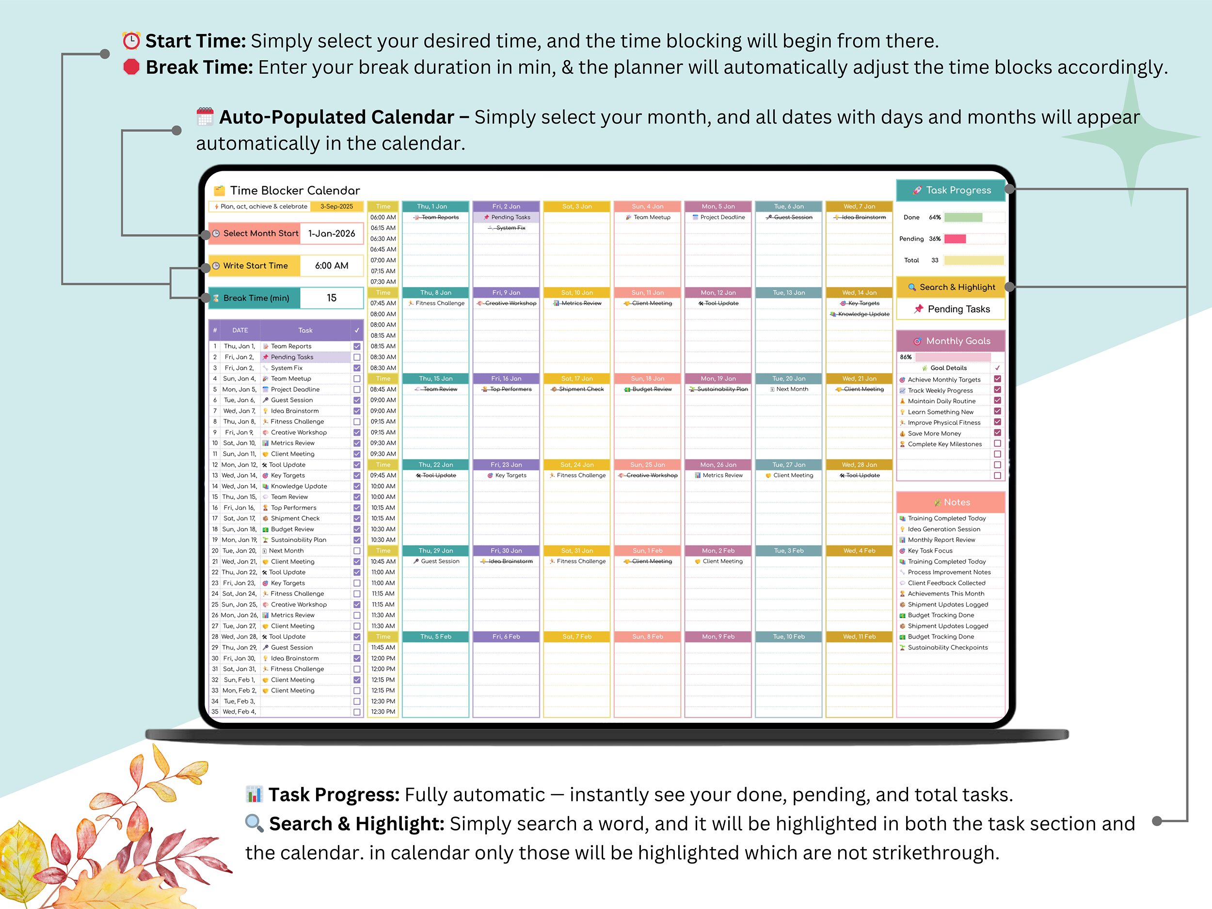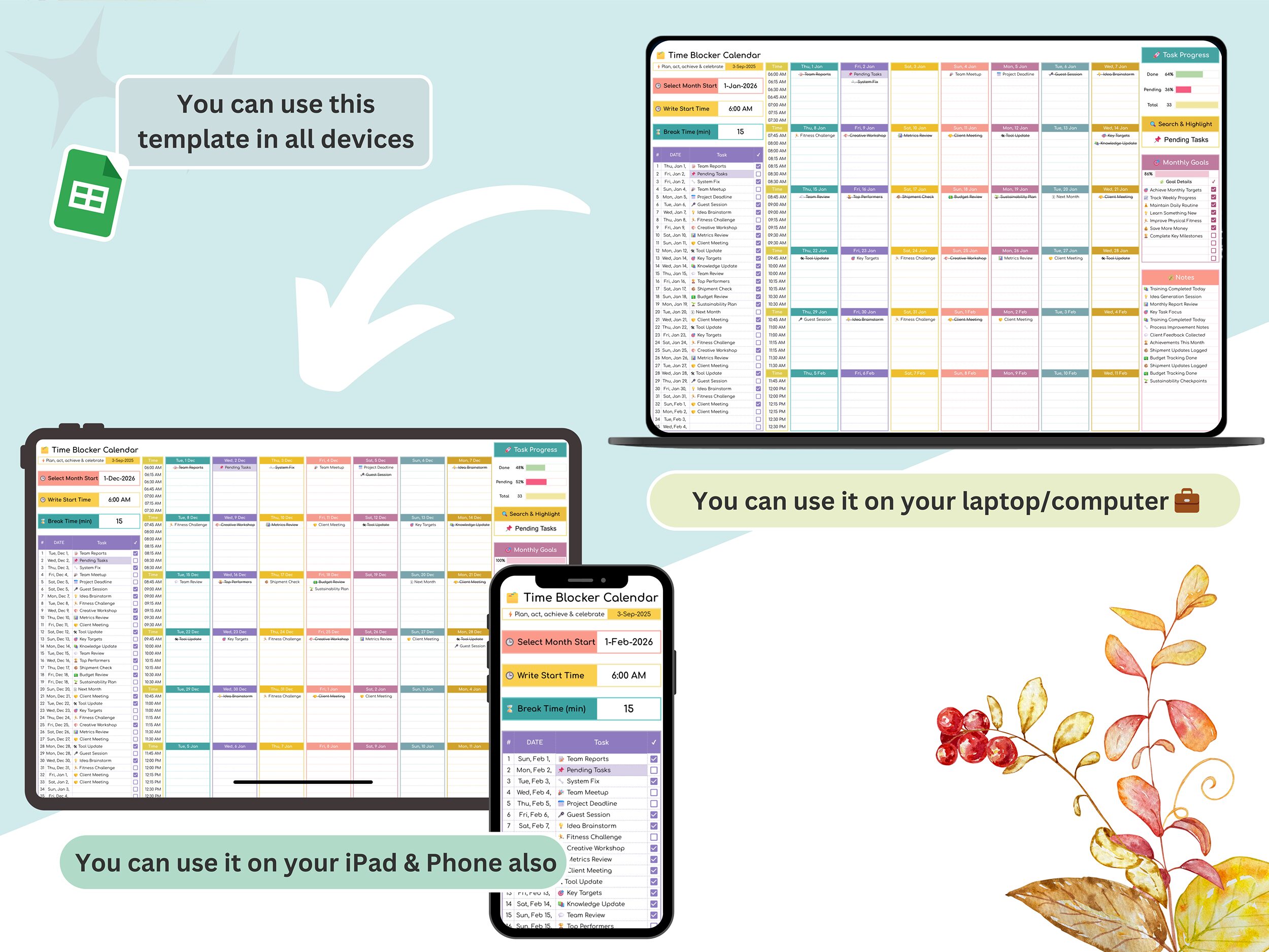 Stay organized and productive with our Time Blocker Calendar Spreadsheet – the ultimate Google Sheets planner to help you manage your tasks, events, routines, and goals all year round! ⏰✨