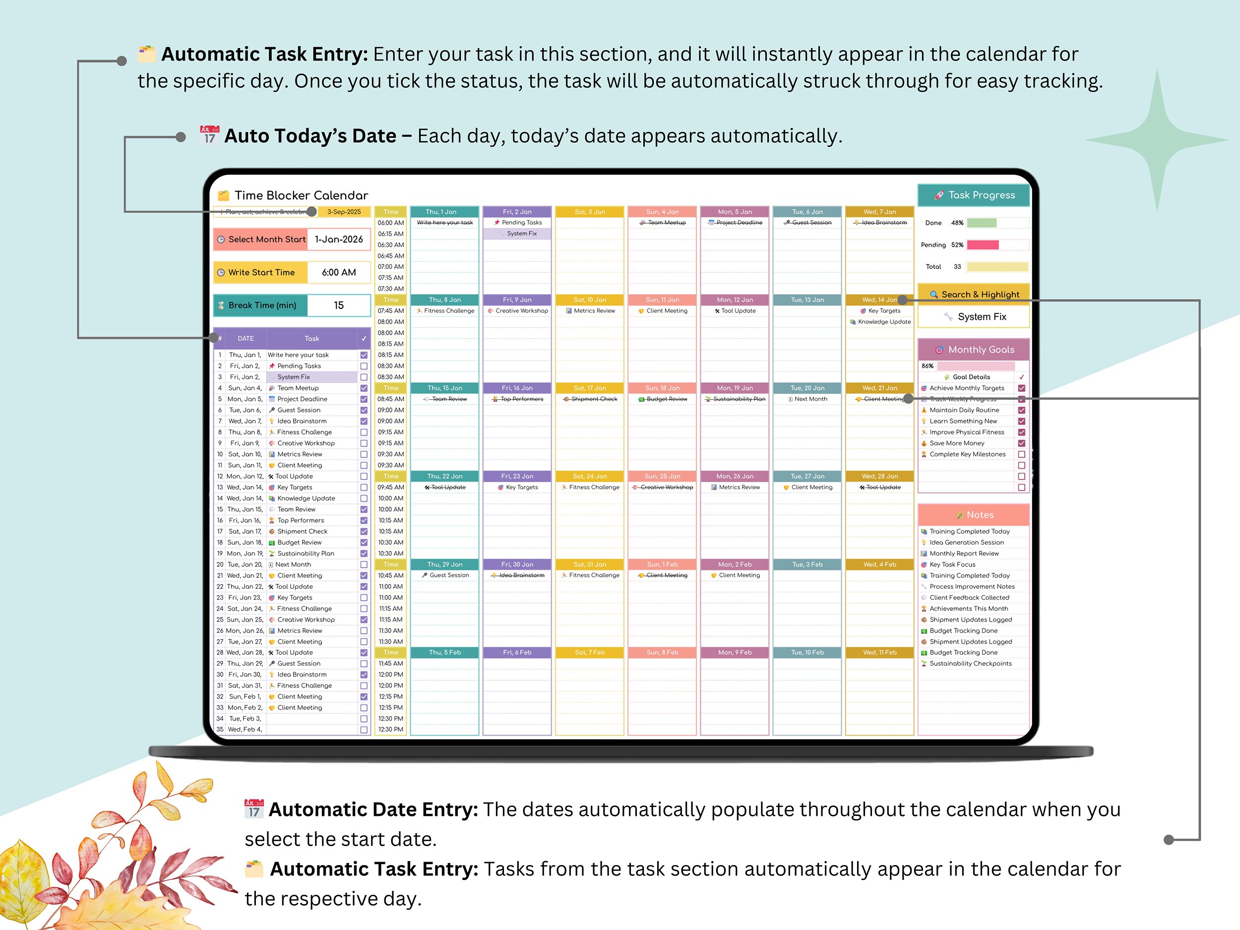 This all-in-one planner includes a 12-month time-blocking system, task tracker, and automated progress dashboards designed to help you plan effectively, focus on priorities, and achieve your goals with clarity and consistency.