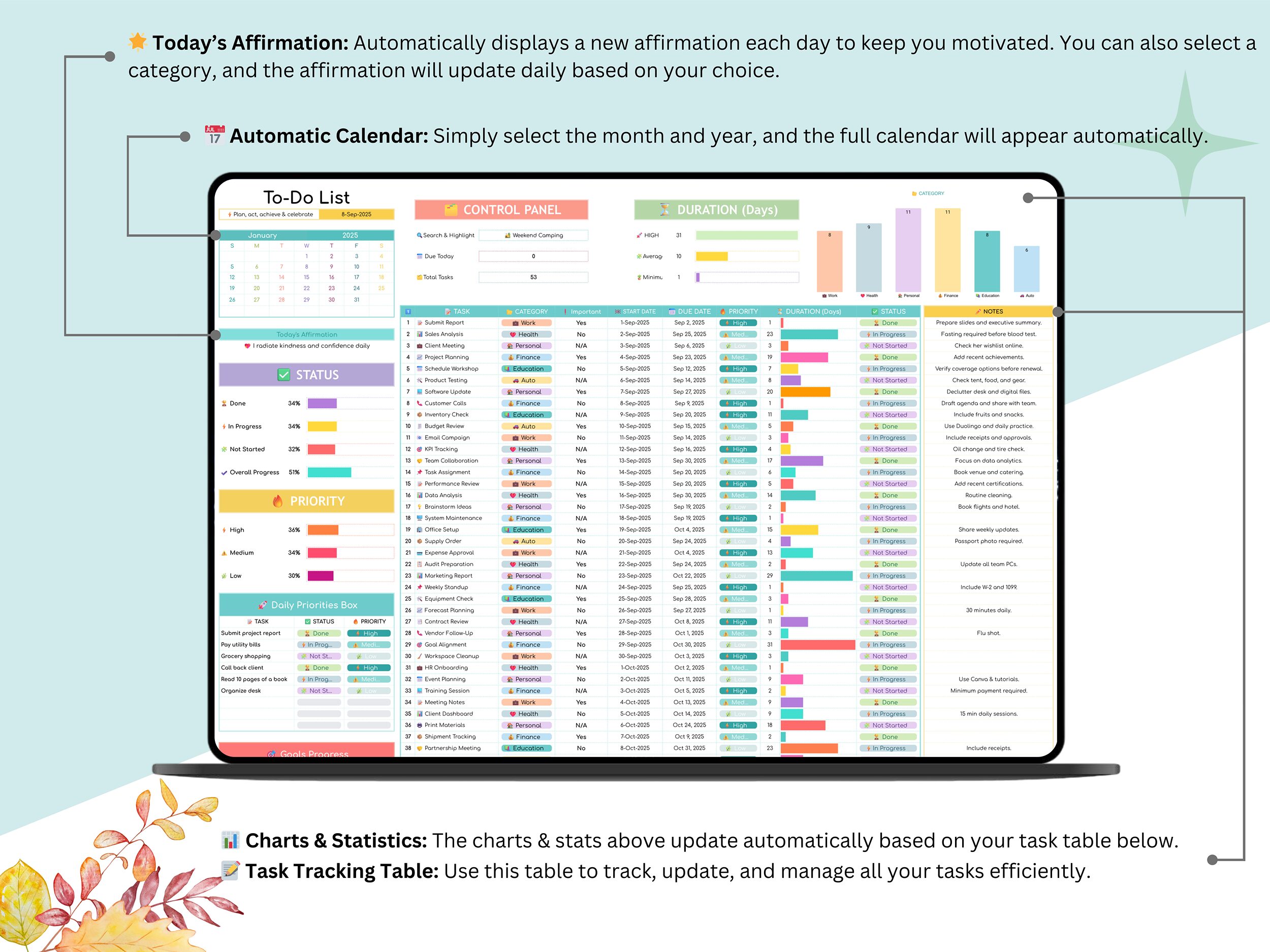 π To-Do List Tab β Track tasks with deadlines, priorities, and completion status.