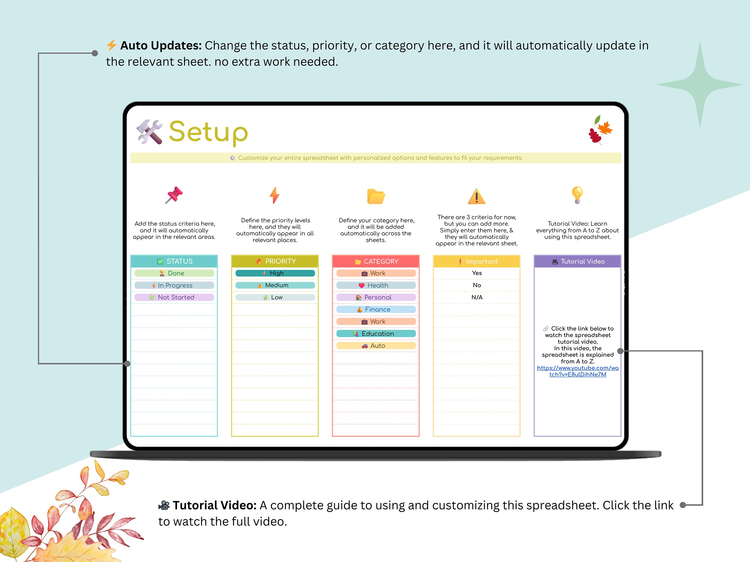 βοΈ Setup Tab β Customize categories, priorities, and preferences to fit your workflow.