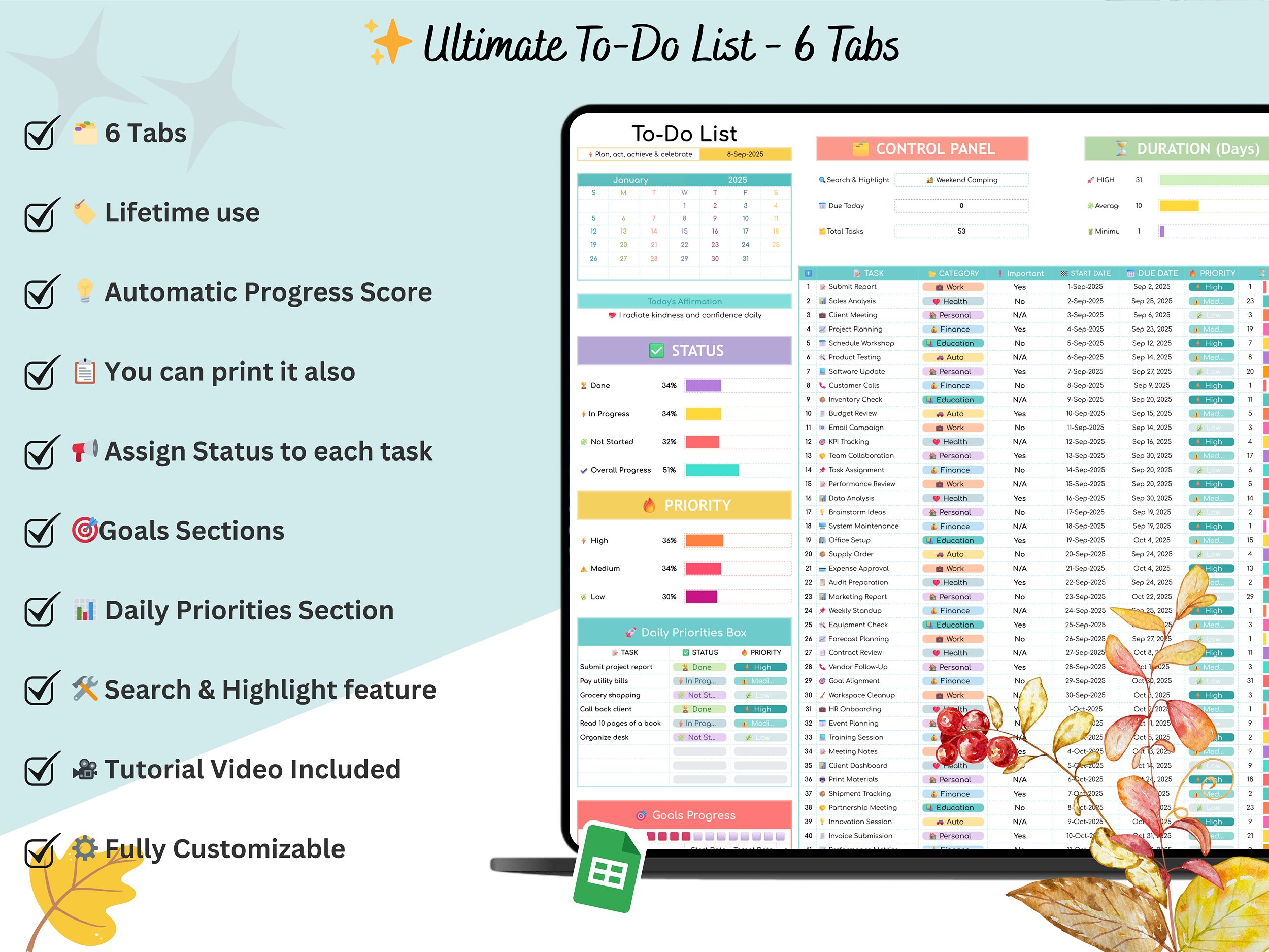To-Do List Spreadsheet (Google Sheets). π Below 5 Tabs Included: